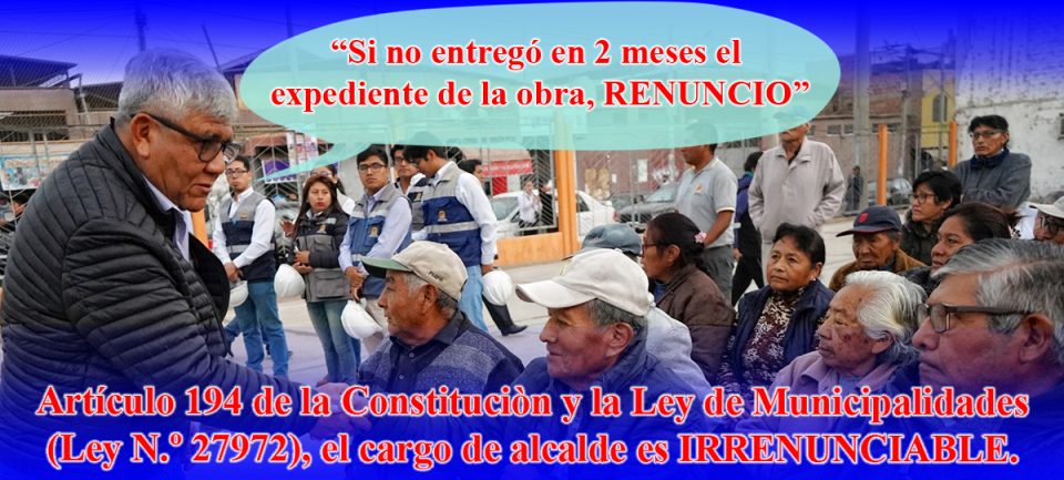 TACNA. — El alcalde provincial de Tacna, Pascual Güisa Bravo, realizó recientemente una polémica declaración durante su visita a la Junta Vecinal Leoncio Prado, donde afirmó que si no cumple con presentar el nuevo expediente de la obra que quedo abandonada por la contratistas—como el mejoramiento de calles y veredas— renunciaría a su cargo. Sin embargo, esta promesa ha generado controversia, ya que según la ley peruana, los alcaldes no pueden renunciar libremente a sus funciones.