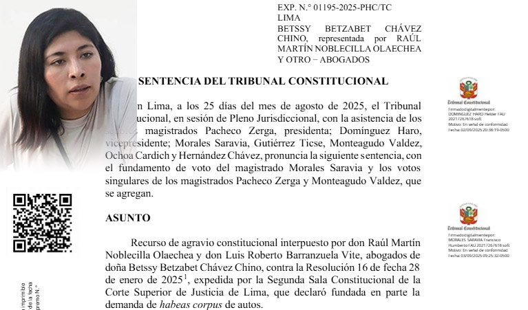 La resolución del máximo intérprete de la Constitución señala que Chávez permaneció detenida de manera arbitraria por ocho días, luego de vencido el plazo de los 18 meses de prisión preventiva. El TC consideró que el Ministerio Público y el Poder Judicial incurrieron en una “práctica preocupante” al solicitar y resolver la extensión de la medida fuera de los plazos legales.