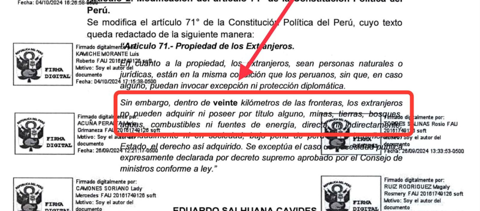 El Congreso de la República a través de su presidente Eduardo Salhuana ha presentado un proyecto de ley en la cual solicitan modificar el artículo 71 de nuestra constitución en la cual reducen de 50 km. a 20 km. el área en la que los extranjeros pueden adquirir propiedades en......